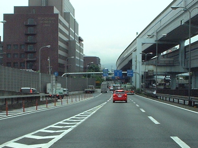 昆陽の交差高架を走り、伊丹市から尼崎市へ入る 降りて歩道橋があり、側道と合流する